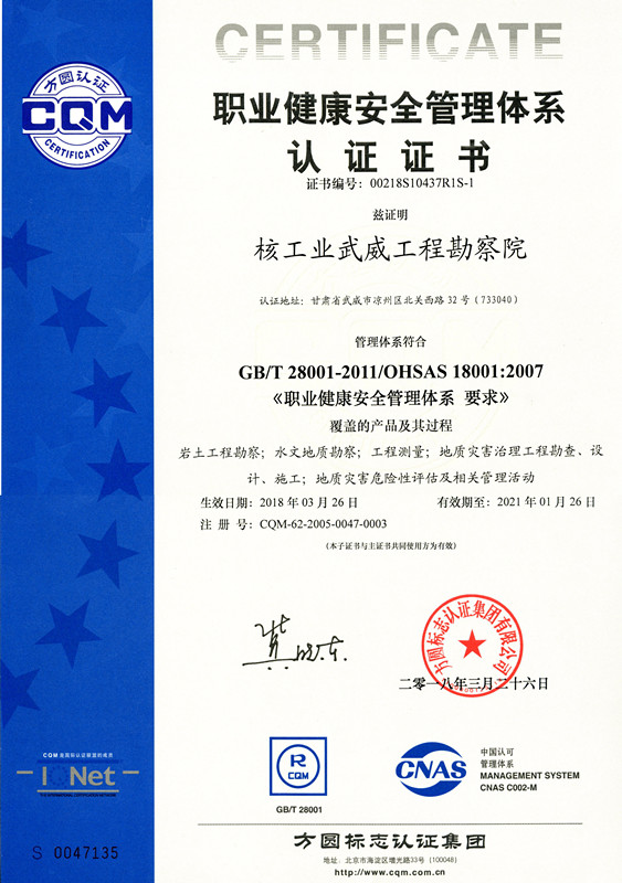 • 勘察院职业健康安全管理体系证书